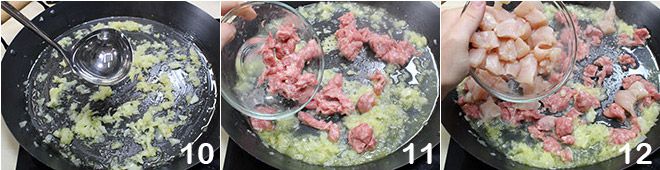 Refogue a cebola em fogo baixo, adicionando uma concha de caldo de frango para não queimá-la 10, então adicione a linguiça 11 e o frango 12.