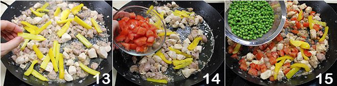 Deixe dourar as carnes por alguns minutos, depois junte o pimentão 13, os tomates 14 e por fim as ervilhas debulhadas e escorridas 15.