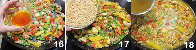 Adicione um pouco de caldo (cerca de uma concha) e o açafrão, que você terá dissolvido em uma pequena quantidade de caldo 16, então deixe cozinhar tudo por alguns minutos. Junte a fregola, mexendo 17, e o restante do caldo 18 (sugerimos deixar de lado ainda algumas conchas para adicionar caso a paella seque muito);