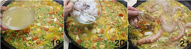 cubra tudo com o líquido de cozimento dos mexilhões, que você havia reservado. Deixe cozinhar a paella em fogo médio, por cerca de 20 minutos (o tempo de cozimento da fregola pode variar: verifique o que está escrito na embalagem da fregola em sua posse). Após 10 minutos, durante os quais você terá verificado a fregola mexendo frequentemente e adicionando caldo se necessário, adicione as lulas 20 e, após 5 minutos, também os camarões 21.