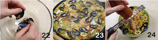 Agora, resta adicionar o último elemento: os mexilhões. Elimine uma das conchas, aquela sem molusco 22, então, perto do final do cozimento, adicione os mexilhões à paella 23 (cerca de 3 minutos antes de apagar o fogo). Quando a paella algherese estiver pronta, adicione pimenta a gosto e sirva. Para finalizar, rale abundantemente bottarga de tainha em lâminas sobre cada prato 24 e, se desejar, regue com um fio de azeite de oliva extra virgem.