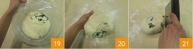 Passado o tempo de crescimento 19, transfira a massa para uma superfície levemente enfarinhada 20 e divida em 8 pedaços de 100-110 g 21.