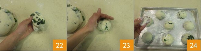 Dê a cada porção uma forma esférica 22, depois enrole a massa girando-a sobre uma superfície 23 e transfira para uma assadeira. Neste ponto, polvilhe a superfície com um pouco de farinha 24