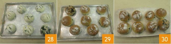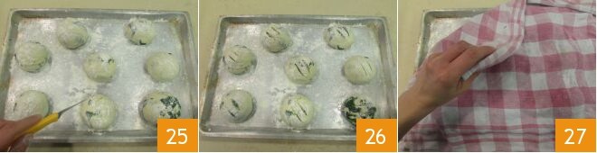 e faça dois cortes na superfície de cada pão (25-26). Cubra com um pano 27