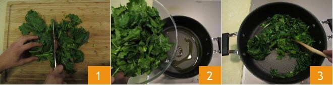 Para preparar os pães com folhas de nabo, a primeira coisa a fazer é lavar as folhas de nabo, depois cortá-las em pedaços com uma faca 1. Aqueça um pouco de óleo em uma panela, adicione as folhas de nabo 2 e cozinhe mexendo de vez em quando 3
