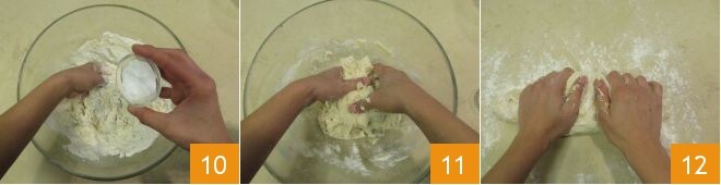 e comece a amassar. Antes que esteja completamente absorvido, adicione também o sal 10. Continue trabalhando a massa 11, depois transfira para uma superfície enfarinhada e amasse até obter uma massa homogênea 12.