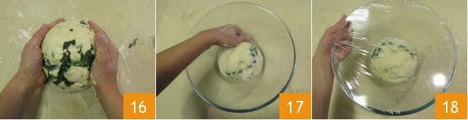 Trabalhe a massa por mais 5 minutos, depois forme uma esfera 16 e coloque em uma tigela 17. Cubra com filme plástico 18 e deixe crescer por pelo menos 3 horas, até que dobre de volume.