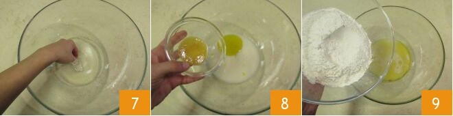 e misture com as mãos ou com uma colher para dissolver completamente 7. Adicione o óleo e o mel 8, depois adicione gradualmente a farinha 9