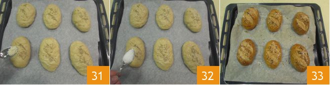 e de gergelim 31. Adicione também flocos de sal na superfície 32 e asse em forno estático preaquecido a 220°C na prateleira mais baixa por 30 minutos até que estejam bem dourados. Retire do forno 33 e deixe os seus pães de cerveja esfriarem antes de servi-los.