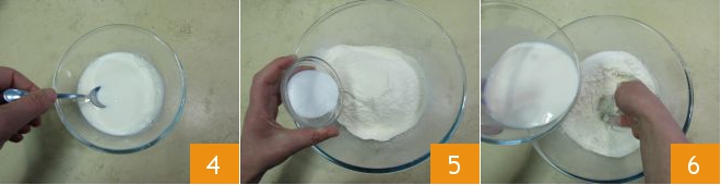 Misture com uma colher até que o fermento esteja completamente dissolvido 4. Em seguida, na tigela com as farinhas, adicione o açúcar 5 e o leite aos poucos enquanto você amassa com as mãos 6.