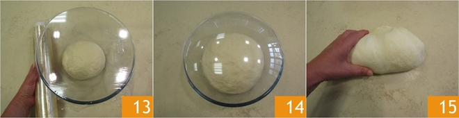 Transfira para uma tigela, cubra com filme plástico 13 e deixe crescer por cerca de 2 horas a uma temperatura de cerca de 24-26°C. Uma vez passado o tempo indicado, sua massa terá crescido em volume 14. Transfira para a superfície de trabalho e manuseie brevemente para obter um rolo 15.