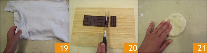 Continue com todas as outras, cobrindo com um pano úmido para não secar a massa e deixe descansar por 10 minutos 19. Pegue as barras de chocolate e corte em pedaços 20. Agora, pegue uma das bolinhas e achate-a com as mãos, até obter um disco de 10 cm.