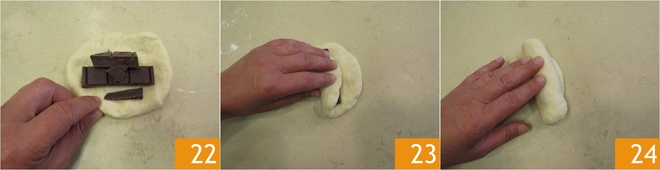 Coloque o chocolate no centro, cerca de 30 g cada 22. Cubra com uma parte da massa 23 e enrole 24.