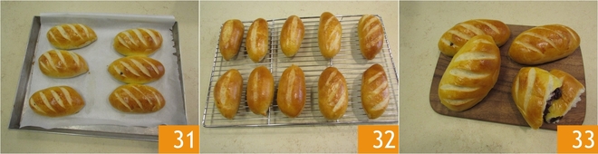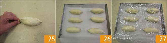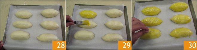 Deixe crescer por 1 hora, ou até que dobrem de volume 28. A temperatura recomendada é de 24-26°C. Pincele os pãezinhos com gema de ovo e creme batidos juntos 29, depois faça cortes oblíquos, 3 ou 4 em cada pão.