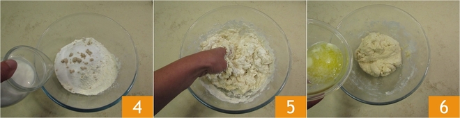 Adicione o leite em temperatura ambiente 4 e comece a amassar com as mãos 5. Quando obtiver uma mistura homogênea, adicione uma parte da manteiga derretida, já morna 6.