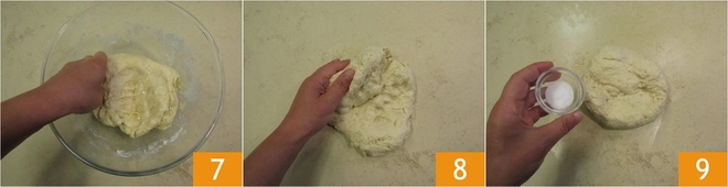 Amasse novamente até ser completamente absorvido 7 e adicione mais um pouco de manteiga. Continue assim até terminar toda a manteiga, deixando-a absorver lentamente. Transfira a massa para uma superfície de trabalho 8 e adicione o sal 9.