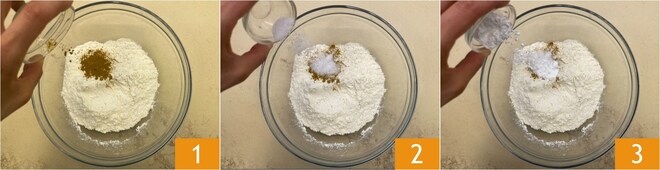 Para preparar os veggie buns ao curry, a primeira coisa a fazer é preparar a massa: em uma tigela, coloque a farinha, o curry 1, o sal 2 e o fermento instantâneo 3.
