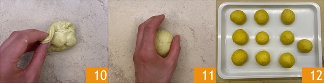 Pegue cada pedaço e forme bolinhas, depois leve as pontas ao centro 10, vire a massa e trabalhe-a para obter uma forma esférica 11. Coloque as bolinhas em uma bandeja 12 e deixe descansar, cobertas com um pano.
