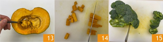 Enquanto isso, prepare o recheio: limpe a abóbora, removendo as sementes e os filamentos internos 13, retire a casca e corte a polpa em pedaços 14. Divida o brócolis em pequenos floretes 15.