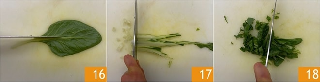 Separe o caule das acelgas das folhas 16, depois corte tanto os caules 17 quanto as folhas em pedaços 18.