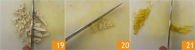 Corte o tofu em cubos 19. Por fim, pique finamente o alho, removendo o broto interno 20, e o gengibre descascado 21.