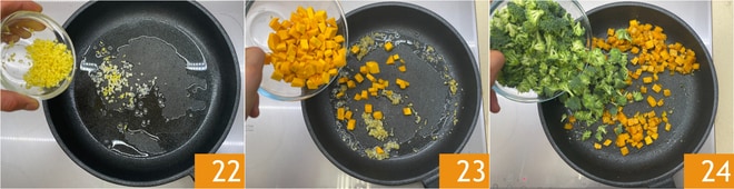 Coloque o alho e o gengibre em uma frigideira com um fio de óleo de sementes 22 e deixe fritar em fogo baixo por cerca de 5 minutos. Adicione a abóbora 23 e refogue por mais 5 minutos, depois junte o brócolis 24.
