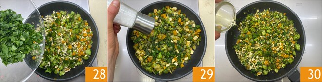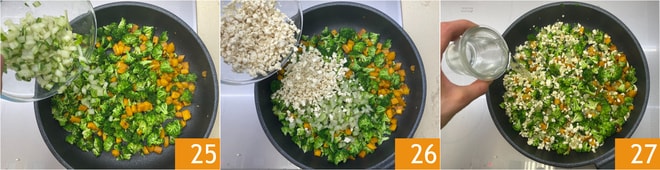 Adicione também os caules das acelgas 25 e o tofu 26, depois refogue por mais 5 minutos. Neste ponto, adicione um pouco de água 27, abaixe o fogo e cozinhe por cerca de 10 minutos.