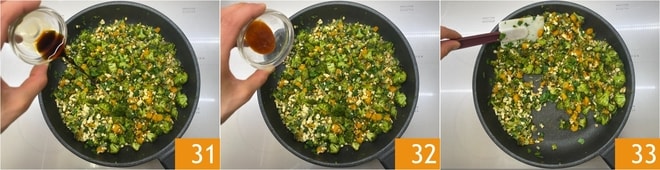 Adicione o molho de soja 31 e o molho sriracha 32, depois misture bem tudo 33. Reserve.