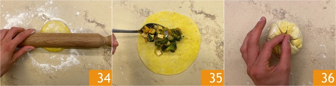 Retome as bolinhas de massa e estenda-as sobre a bancada levemente enfarinhada para formar discos finos 34. Adicione ao centro de cada disco cerca de 60 g de recheio 35, depois dobre as pontas para dentro e aperte-as para selar os pacotinhos 36. À medida que você for formando os pães, coloque-os em uma bandeja com a parte selada para baixo.