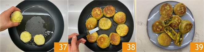 Aqueça o óleo de sementes em uma frigideira e coloque os pães com a parte selada voltada para baixo 37. Deixe dourar de um lado, depois vire-os para o outro lado e continue cozinhando em fogo médio-baixo 38; no total, levará cerca de 15 minutos. Acompanhe seus veggie buns ao curry com molho de soja e sirva-os ainda quentes 39!
