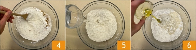 Misture bem 4, depois adicione a água 5 e o óleo 6.