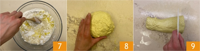 Amalgame a mistura com uma colher 7, depois continue a trabalhar na bancada até obter uma massa homogênea 8; se for difícil de manusear, você pode untar levemente os dedos e a bancada. Forme um cilindro e divida-o em 10 pedaços de cerca de 55 g cada 9.