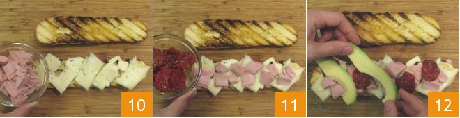 coloque as fatias de queijo por cima e distribua os pedaços de atum escorrido 10. Tempere com os tomates secos escorridos 11 e as fatias de abacate 12,