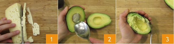 Para preparar os pãezinhos com atum e abacate, corte o asiago em fatias finas 1, depois corte o abacate ao meio, retire o caroço 2 e com uma colher retire a polpa 3.