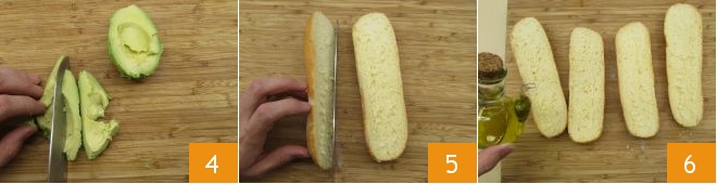 Corte a polpa em fatias 4. Pegue as baguetes e corte-as ao meio 5; regue com um fio de azeite de oliva 6.