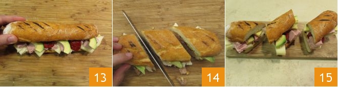 feche com a outra metade da baguete 13 e corte diagonalmente em três partes iguais a baguete recheada 14, sirva imediatamente seus pãezinhos com atum e abacate 15.