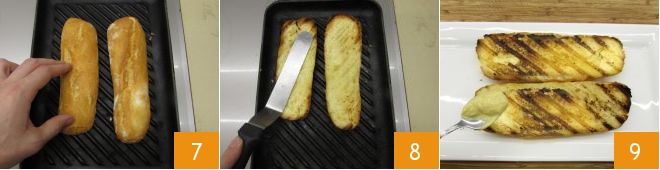 Toaste o pão em uma grelha quente por 2 minutos do lado do miolo 7 e cerca de 1 minuto do lado externo 8. Transfira para uma tábua (ou prato de servir) e espalhe mostarda em uma das metades 9,