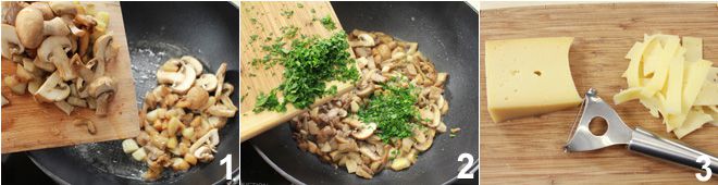 Para preparar os pãezinhos com cogumelos e fonduta de fontina, comece preparando os cogumelos salteados: limpe bem todos os cogumelos, raspando e esfregando-os com um pano úmido, depois corte-os em pedaços, preservando, se possível, a forma do cogumelo. Derreta 15 g de manteiga em uma frigideira antiaderente, adicione um dente de alho cortado ao meio e deixe dourar, em seguida, adicione os cogumelos em pedaços 1 e cozinhe por alguns minutos em fogo alto, tomando cuidado para que os cogumelos não quebrem. Em seguida, incorpore a salsa picada 2, sal e pimenta a gosto e complete o cozimento.