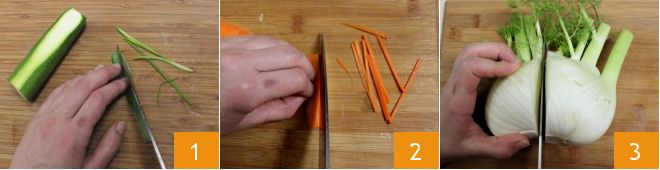Para preparar os pãezinhos de legumes julienne e Asiago, comece limpando e cortando os legumes em julienne (você também pode consultar a Escola de cozinha: como cortar os legumes). Lave bem os legumes em água corrente, depois apare as abobrinhas e corte-as em julienne 1. Faça o mesmo com as cenouras 2 depois de remover as extremidades e descascá-las. Em seguida, corte o funcho ao meio 3.