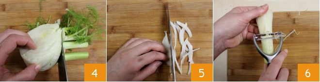 Remova as pontas e a camada externa mais dura 4. Em seguida, reduza a quantidade necessária de funcho em julienne 5. Passe a eliminar a camada externa do aipo com um descascador de legumes 6.