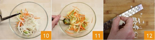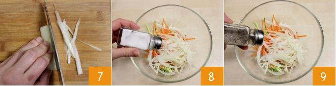 Reduza também o aipo em julienne 7 e depois transfira os legumes para uma tigela. Em seguida, sal e pimenta a gosto (8-9).