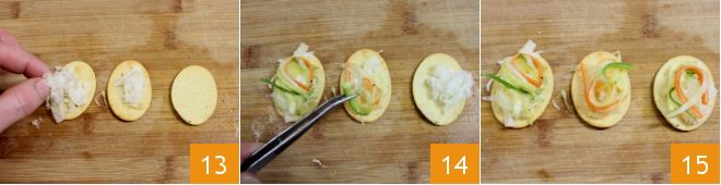 Comece pelo queijo para montar os pãezinhos: coloque uma porção de lascas em cada pãozinho 13. Em seguida, use uma pinça de cozinha para adicionar os legumes em julienne 14. Complete a operação para todos os pãezinhos 15 e depois transfira-os para uma tábua ou um prato de servir para oferecer aos seus convidados!