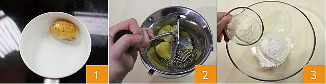 Para preparar as focaccias de batata com cerveja, primeiro coloque a batata para ferver em bastante água 1. Quando estiver bem macia, descasque-a e amasse-a com um espremedor de batatas 2. Em uma tigela, misture a farinha de semolina e a farinha de trigo 00 3.