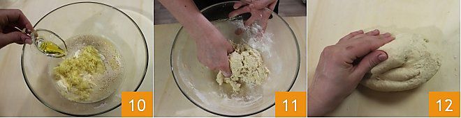 por fim o óleo 10. Misture então com as mãos, juntando todos os ingredientes com as mãos 11 e depois transfira a massa para uma superfície de trabalho e continue a amassar até obter uma massa lisa e firme 12. Se você tiver uma batedeira, pode amassar primeiro com a pá em velocidade média, para juntar os ingredientes, e depois com o gancho por 10 minutos, sempre em velocidade média.