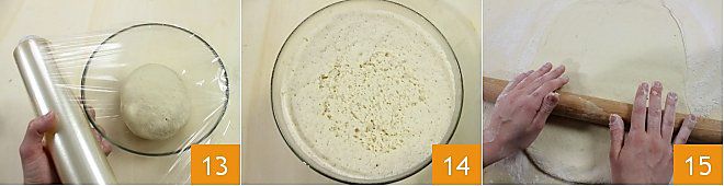 Coloque a massa em uma tigela e cubra com filme plástico 13. Deixe fermentar por 2 horas à temperatura ambiente, ou em um ambiente morno, até que a massa tenha dobrado de volume e esteja bem inchada 14. Estenda sobre uma superfície enfarinhada uma folha com cerca de 1 cm de espessura 15 e