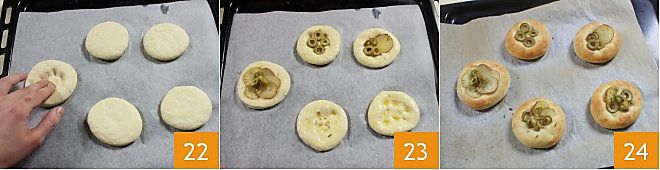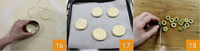 com um cortador de massa com diâmetro de 8,5 cm, corte as focaccias 16. Coloque-as em uma assadeira forrada com papel manteiga e deixe fermentar por mais 1 hora 17. Enquanto isso, corte as azeitonas em rodelas 18 e