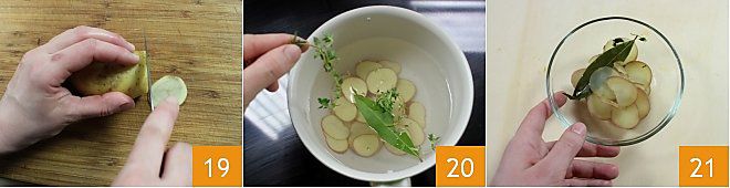 corte as batatas bem lavadas, mas não descascadas, em fatias finas 19. Cozinhe as batatas por cerca de 10 minutos em bastante água salgada, aromatizando-a com tomilho e louro 20. Quando as batatas estiverem bem macias, escorra-as 21.