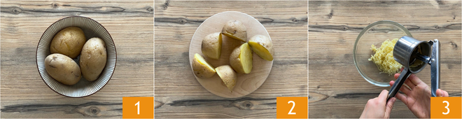 Para preparar os pãezinhos de batata e gorgonzola, primeiro cozinhe as batatas em água fervente salgada por 30-40 minutos, até que estejam macias. Como alternativa, você pode cozinhar as batatas no vapor ou no micro-ondas. Escorra e deixe esfriar um pouco 1. Corte-as ao meio 2 e, usando um espremedor de batatas, esprema-as em uma tigela grande 3. Não será necessário remover a casca antes, pois ela ficará dentro do utensílio.