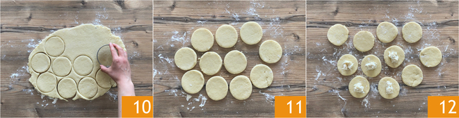 Com um cortador de massa de 8 cm de diâmetro, faça disquinhos 10. Elimine os pedaços de massa 11 e amasse-os novamente para criar mais disquinhos. Coloque uma colher de chá de gorgonzola sobre metade dos disquinhos 12.