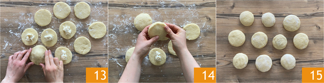 Coloque um disco de massa por cima 13 e sele bem as bordas, pressionando-as com os dedos 14. Continue assim até compor 10 pãezinhos 15.